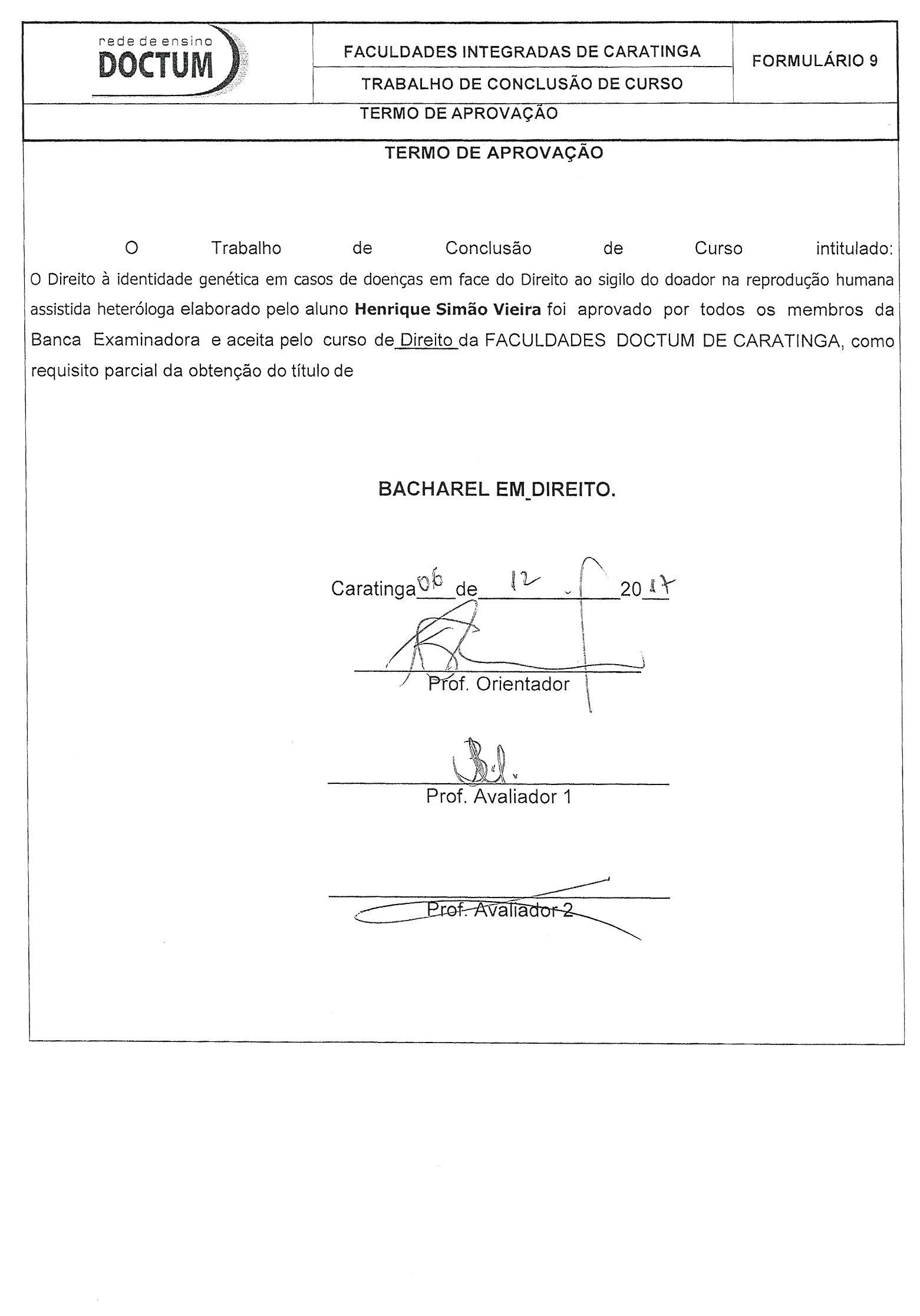 http://hdl.handle.net/123456789/339| Título: | O DIREITO À IDENTIDADE GENÉTICA EM FACE DO DIREITO AO SIGILO DO DOADOR NA REPRODUÇÃO HUMANA ASSISTIDA HETERÓLOGA |