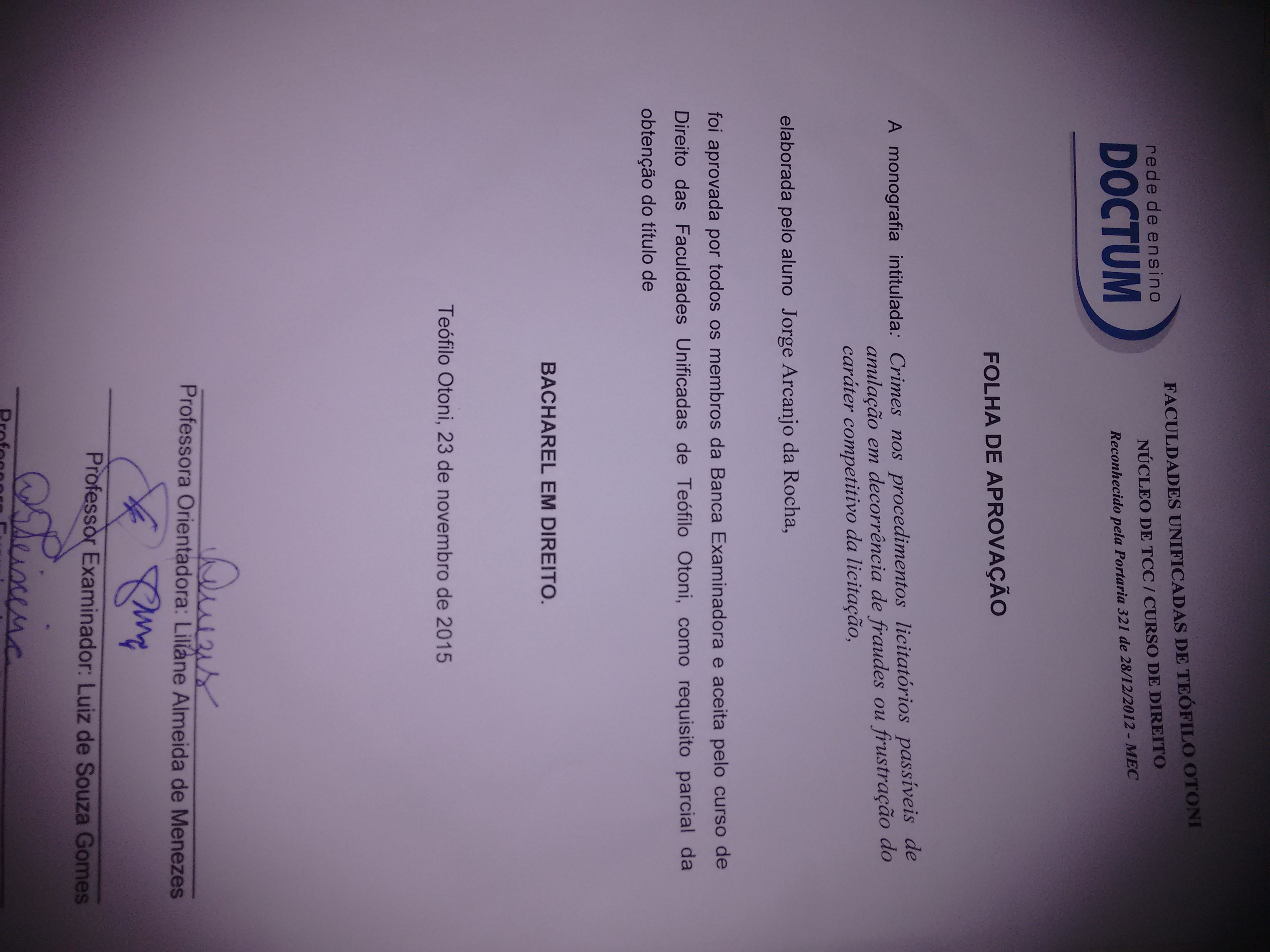 | Citação: | Monografia apresentada ao Curso de Direito das Faculdades Unificadas de Teófilo Otoni, como requisito parcial á obtenção do título de Bacharel em Direito. Área de Concentração: Direito Administrativo e Penal. |